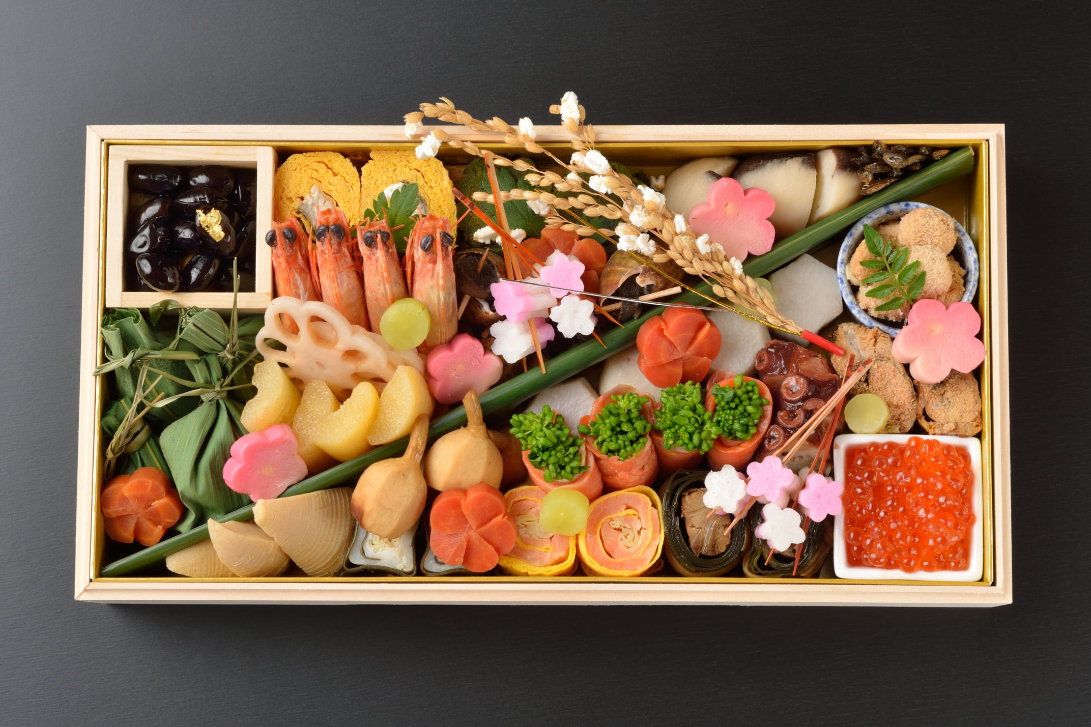 笹巻麩(抹茶)、抹茶入り伊達巻、袱紗玉子、あわび旨煮、鰊昆布巻き、数の子、車海老芝煮、黒豆、花蓮根酢漬け、サーモン錦糸巻、平目竜皮巻、田作り、助子生姜煮、絹さや、塩いくら、六方小芋、筍土佐煮、梅貝酒煮、梅麩、紅白梅蒲鉾、蛸柔らか煮、梅人参煮しめ、菜種サーモン巻、裏白椎茸、六方慈姑、子持ち鮎甘露煮、千社唐